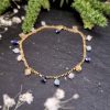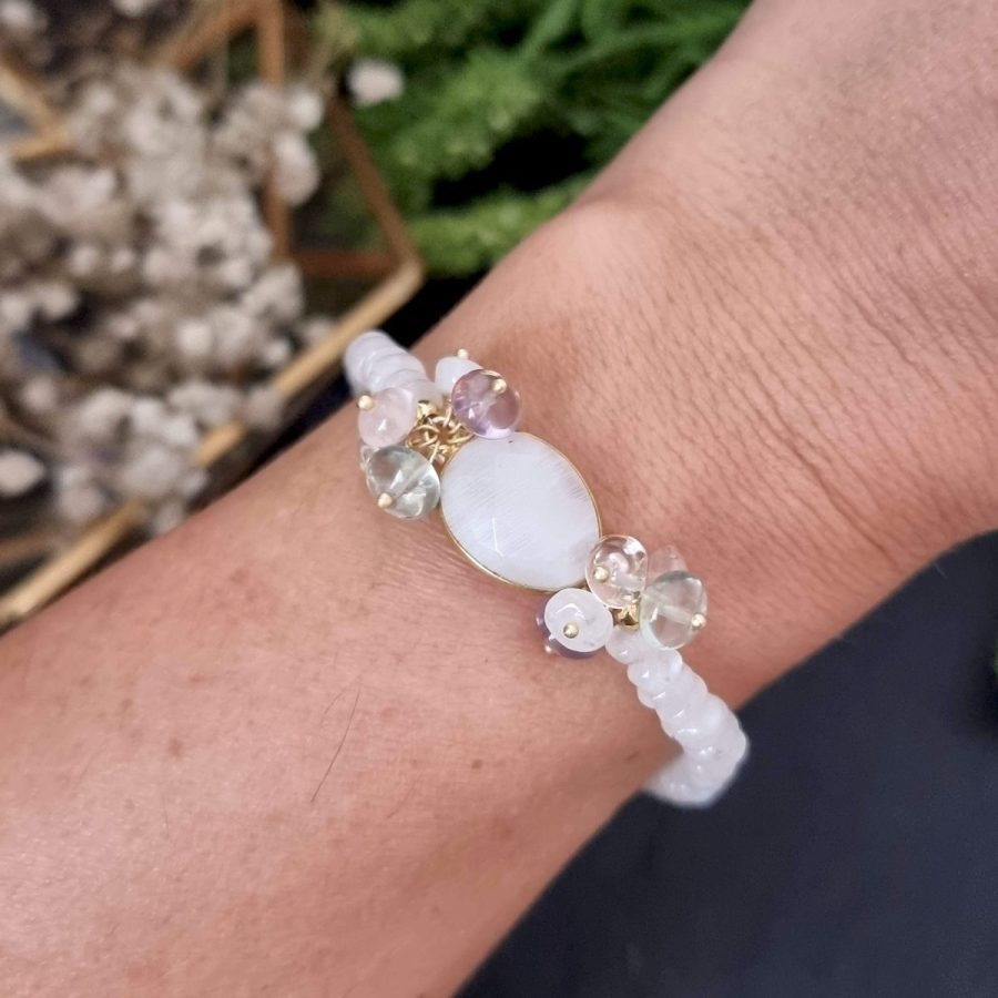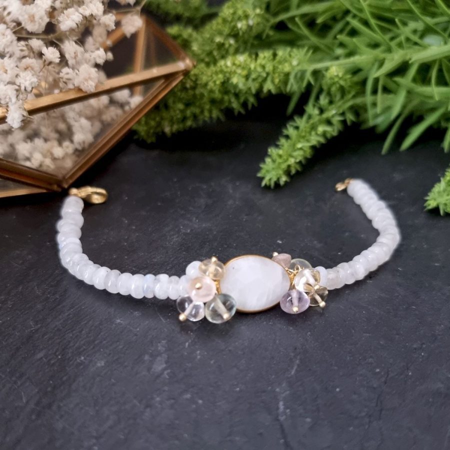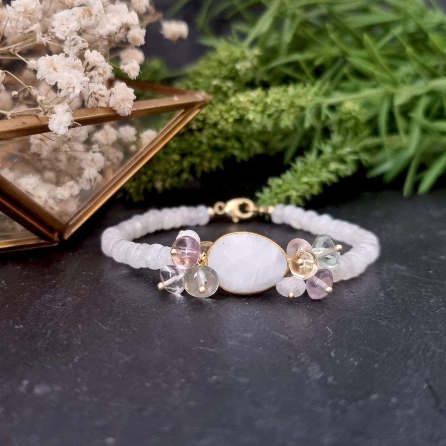 Brazalete con piedra luna engarzada en plata dorada, dos racimos con cuarzo rosa, citrino, piedra luna, fluorita, amatista y aguamarina y pilsera de piedra luna. Cierre con mosquetón un anillas en oro de 14 kt.