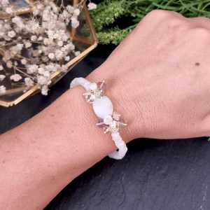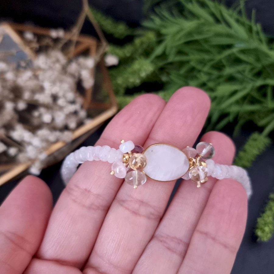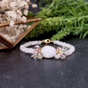 Pulsera de piedra luna, cuarzo rosa, citrino, fluorita, amatista y aguamarina.