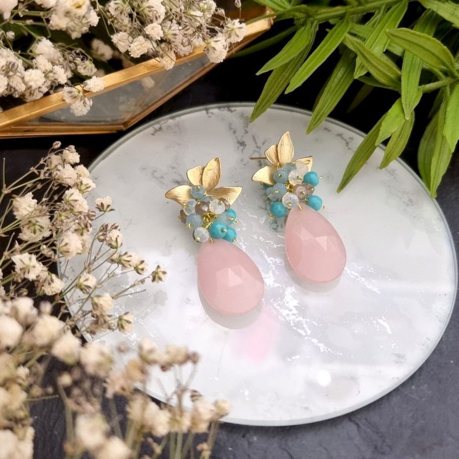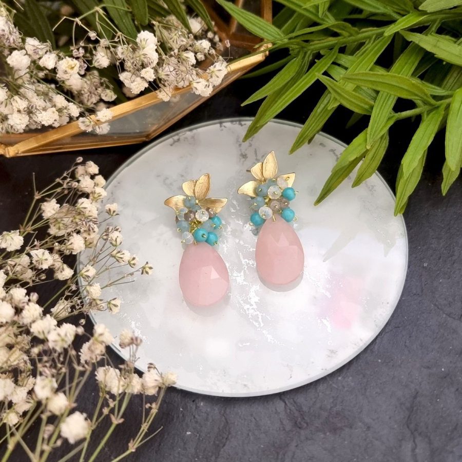 Pendientes de medio racimo con jade rosa, azul, opal y labradorita. Base del pendiente de latón con baño de oro. Tamaño 4,9 cm.