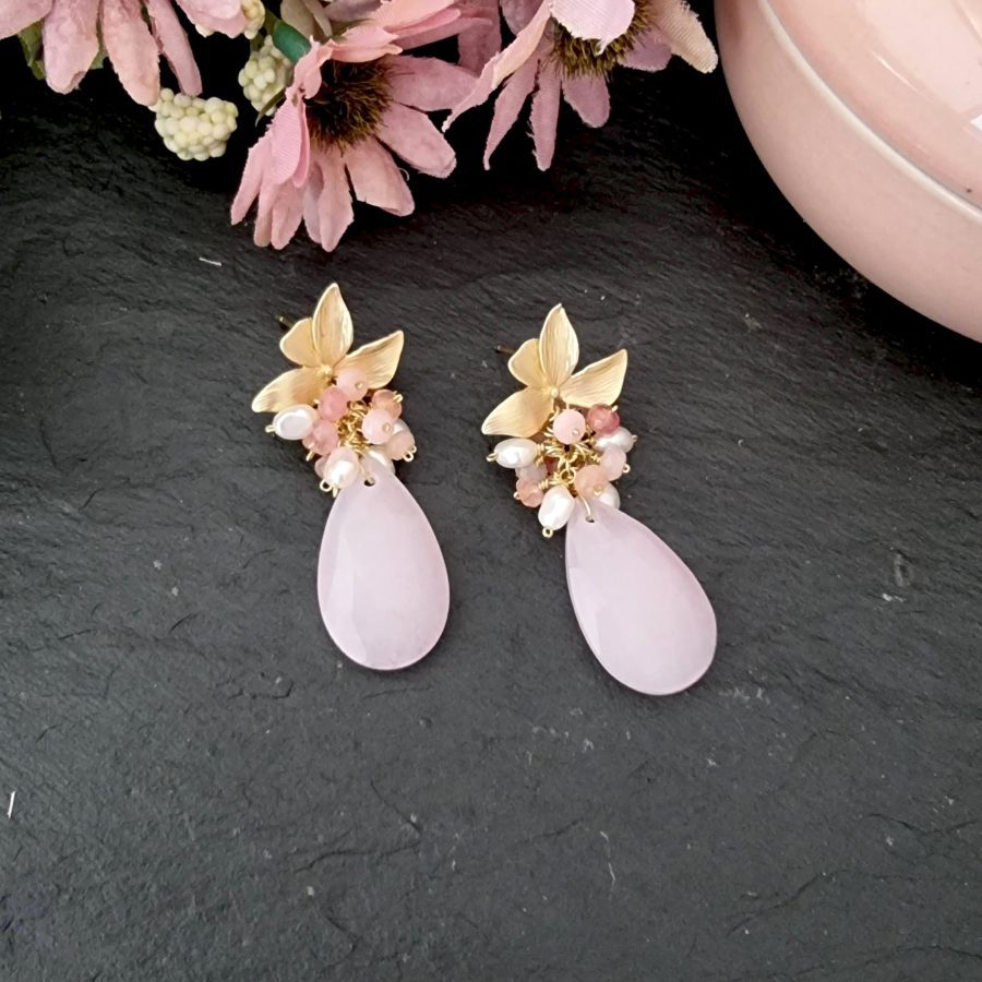 Pendientes con medio racimo en jade rosa y perlas y lágrima de jade rosa claro. Base del pendiente de latón con baño de oro. Tamaño aprox. 4,7 cm.