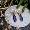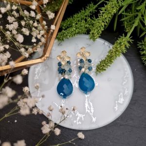 Pendientes de medio racimo con lágrima de jade azul petroleo, azul claro y perlas. Base del pendiente de latón con baño de oro. Tamaño 4,6 cm.