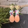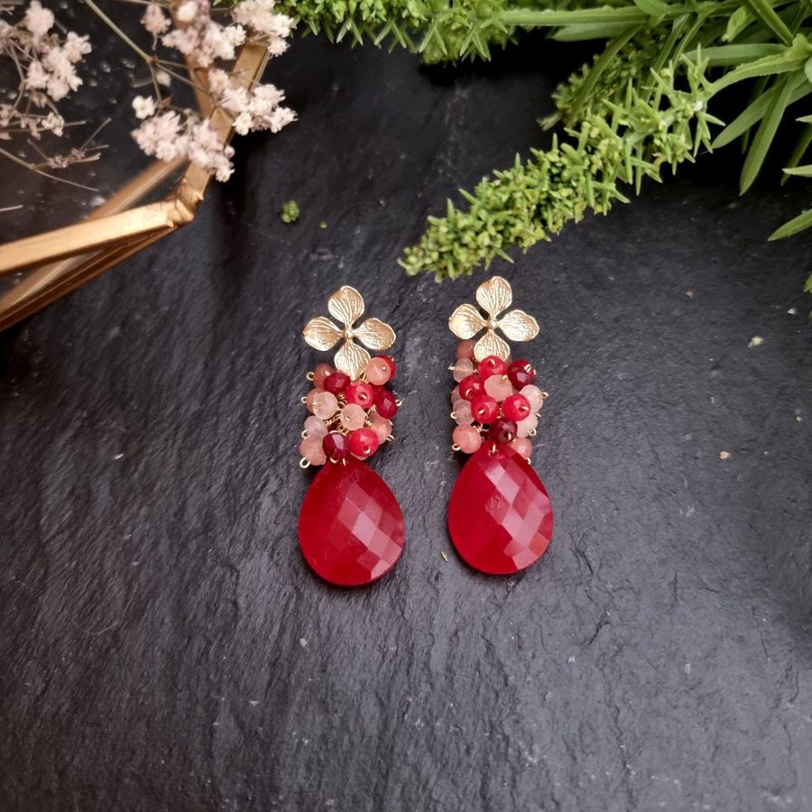Pendientes de medio racimo con lágrima de jade rojo y racimo en jade rojo y nude. Base del pendiente de latón con baño de oro. Tamaño 4,6 cm.