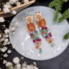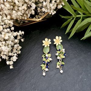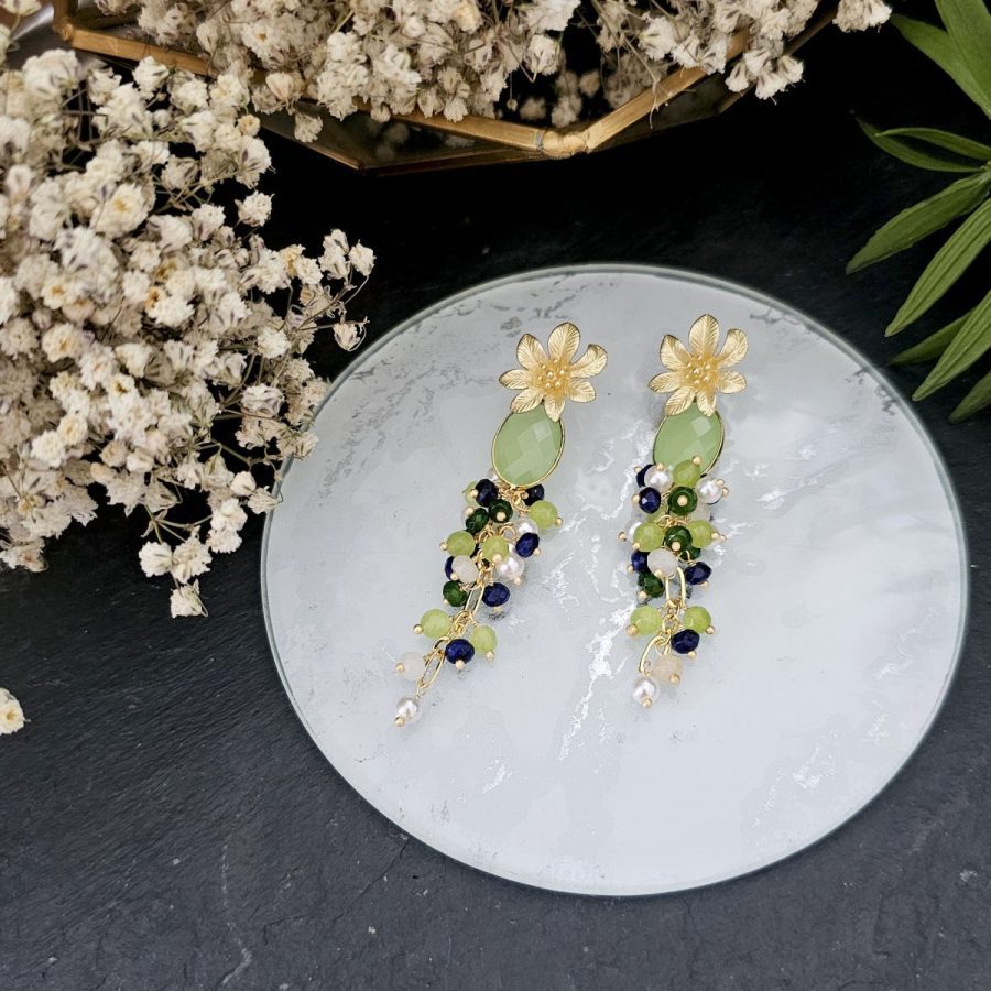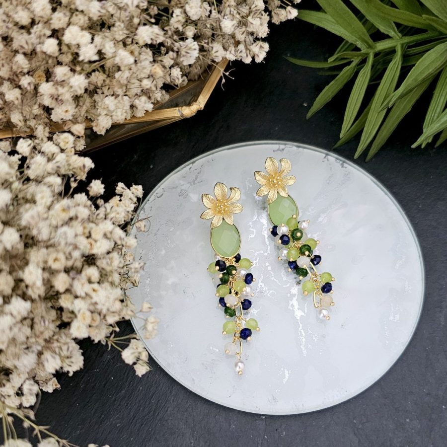 Pendientes de racimo en cascada con calcedonia verde y jade en verde lima, verde oscuro, beige, azul noche y perla. Base del pendiente de latón con baño de oro. Tamaño 6,8 cm.
