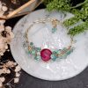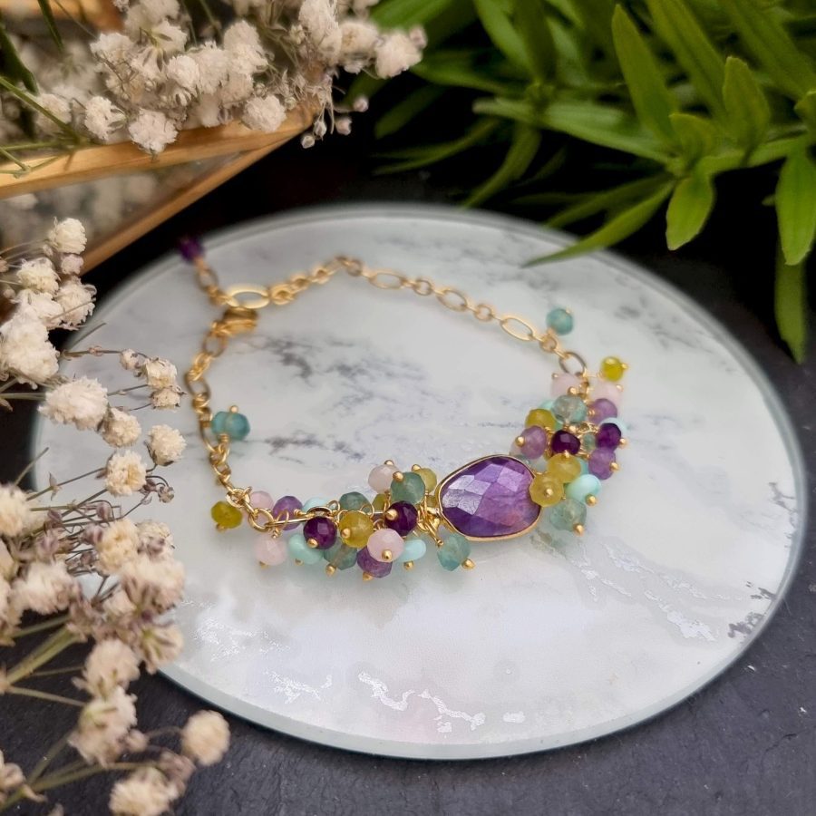 Pulsera de racimo con piedra luna teñida morada, apatito, ópalo azul, jade lima, morado, malva y lila. Pulsera chapada en oro de 18 kt. Tamaño 22 cm, ajustable.